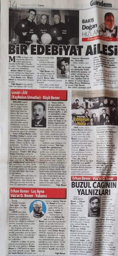 “Bir aile, üç kuşak ve edebiyatın farklı türlerinde yazmış, yapıtlar vermiş beş yazar. Baba Raşit Bener, oğulları Vüs’at O. Bener ve Erhan Bener, kızı Bilge Bener Bölükbaşı ve torun Yiğit Bener.